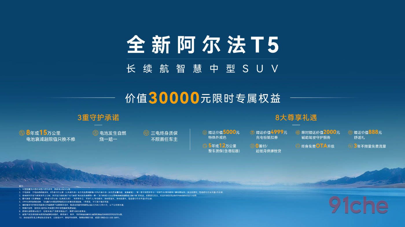 据了解,即日起下订新T5,用户还可以享受价值3万元限时专属权益,尤为“王炸”的是,极狐新T5重磅承诺“三电终身质保、电池自燃烧一赔一、8年或15万公里内电池衰减低于70%只换不修”,三重承诺同时给到,行业内只此一家。