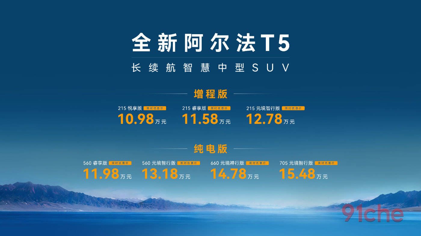 10月28日,"长续航智慧中型SUV"极狐全新阿尔法T5正式上市,包含纯电和增程两种动力形式,共推出7个版型,限时优惠价格10.98万元—15.48万元。随同新车上市,北汽元