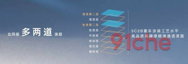 为了让i60更好看、更高级,设计师在车漆工艺上花了很大功夫。埃安i60比同级多了一道色漆层和一道清漆层,达到了豪车级别的“3C2B车漆喷涂工艺”水平,让漆面显得更精致,同时也更耐磨。两道清漆层达到双倍抗氧化、抗紫外线的效果,防腐性能更优异,让车漆经久不褪色。