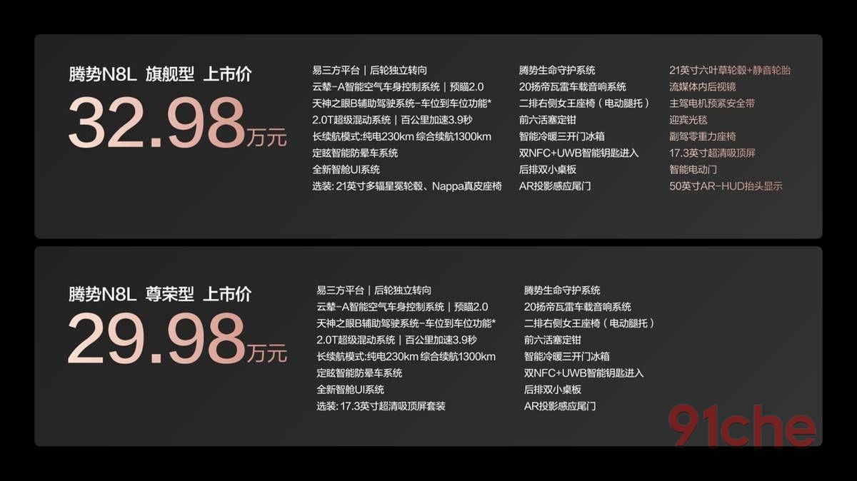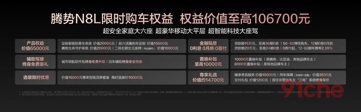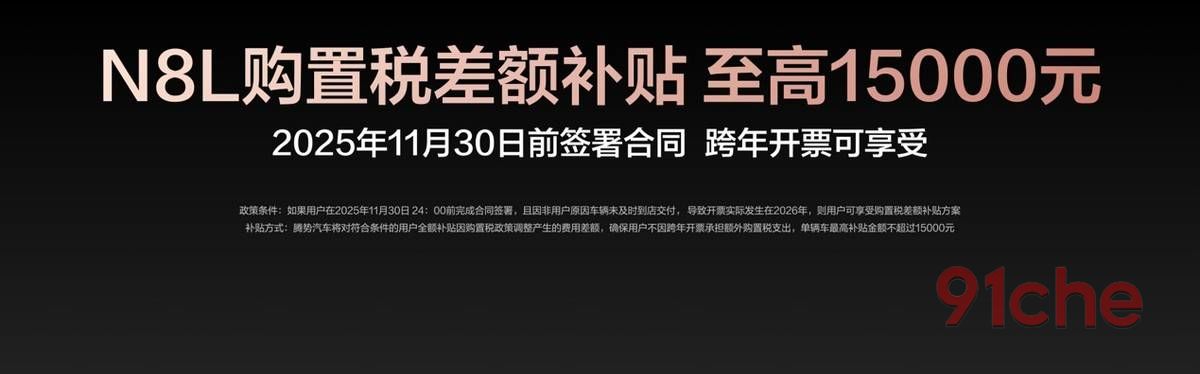 腾势N8L售价为29.98万元-32.98万元,上市以来持续热销,为回馈用户厚爱,推出限时购车权益,价值至高达10.67万元!包括价值1.7万元的三年免息,最高1万元的置换补贴。此外,在2025年11月30日24点前完成合同签署的用户,如果因非用户原因车辆未及时交付,导致开票实际发生在2026年,可享受购置税差额补贴,最高1.5万元!用户不必担心因为交车晚,而享受不到购置税补贴。