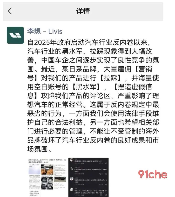 事情的起因无需说太多,皆因东风日产 NX8 在上市期针对理想的车型进行了对标操作,李想认为都是黑公关在捣鬼,公司法务部随后官宣完成取证和报警。