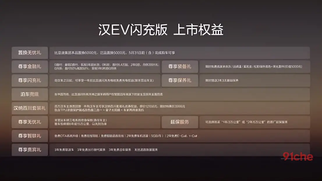 4月28日,比亚迪王朝旗舰汉全新升级,汉 EV 闪充版重磅上市,正式加入闪充阵营,共推出两款车型,售价区间为17.98万~18.78万元。同时,比亚迪还为用户准备了置换无忧礼、1年免费闪充权益、0首付/0利息/0月供任选其一的金融礼、3年3次基础保养、包含3年免费取送车的尊享贵宾礼等共11项权益。