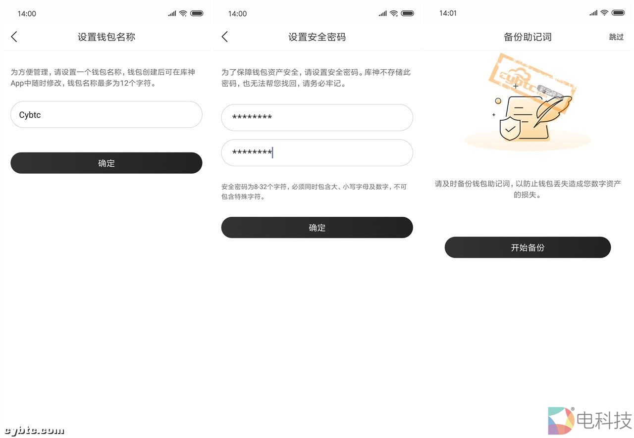 选择“创建钱包”,进入设置菜单,首先需要设置钱包名称,以免混淆多个钱包,设置好一个安全密码,接下来是备份钱包助记词▽