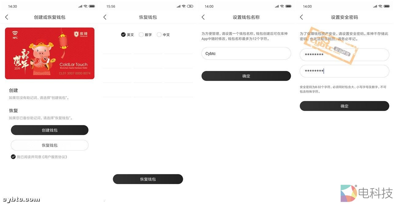 如果备份有其它钱包的助记词,可以使用助记词将其他钱包导入到库神ColdLar Touch钱包内,打开库神App,点击左上角NFC标志,会出现“将卡片和手机进行触碰”提示,此时将ColdLar Touch放到手机背面,App会自动识别卡片类型是标准卡还是新春定制版。选择“恢复钱包”进入恢复词输入界面,输入12位助记词后再给钱包候个名称,设置一个安全密码进入下一步▽