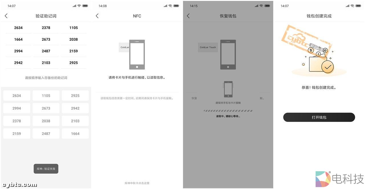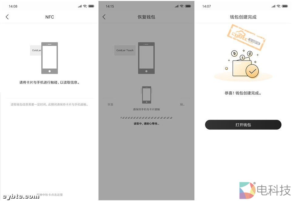 出现“将卡片和手机进行触碰...”的提示,此时将ColdLar Touch放到手机背面,App和ColdLar Touch读取消息后完成钱包恢复▽
