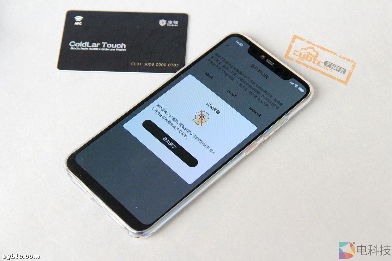 助记词共12位,可选择英文、数字、中文任意一种方式保存,保存好后点击”下一步“进行验证,依据备份好的助记词顺序依次选择词组,顺序完全正确后App会出现“将卡片和手机进行触碰”的提示,将ColdLar Touch放到手机背面,App和ColdLar Touch读取消息后完成钱包创建▽