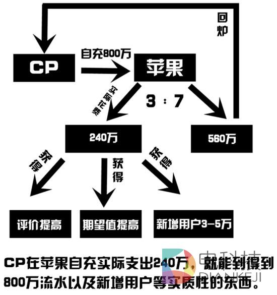 所以发行和CP就需要去渠道刷量,毕竟投资可是头等大事儿,没了投资干什么都是扯淡。于是精明的发行和CP就想出了自充刷榜的办法,简单的加减乘除之后,发现苹果三七分成比五五分成的安卓渠道更为划算。所以他们就在IOS渠道一手卖一手买,左手右手一倒,一个慢动作,游戏流水就刷了上去。