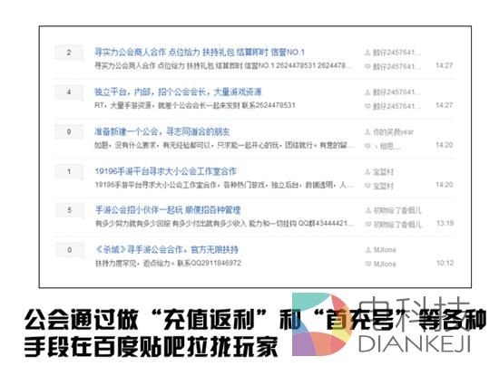 现在的手游公会几乎就是拉玩家谋取折扣的商人。他们先拉来一批无业青年,当然各个都是游戏高手。然后使用统一的名字,进入游戏后疯狂砸钱、霸服。而普通玩家进入游戏后看到排行榜上都是统一命名的公会,往往会过来傍个大腿。等到加入公会后,这些玩家也必须使用统一的名字,从而吸引更多普通玩家。