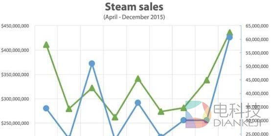 根据Steam Spy的数据结果显示,2015年Steam平台最卖座的前20款游戏总销售额大约已超过6亿5千万美元,其中几款年度大作销量颇为抢眼,比如《侠盗猎车手5》卖出了380万份,约合1.6亿美元;《辐射4》卖出了270万份,约合1.22亿美元。