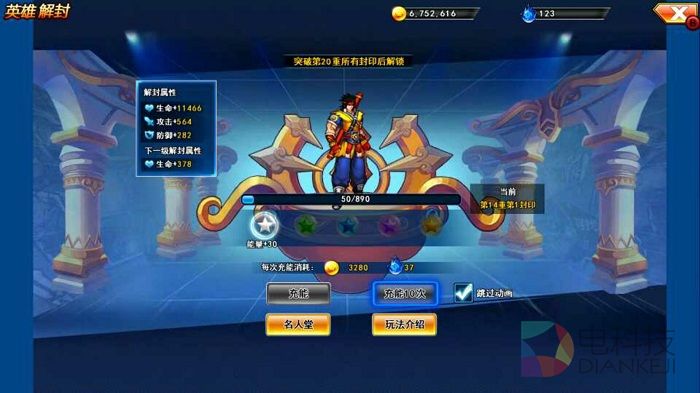 其余英雄都需要通过声望来解封英雄,玩家们可消耗金币和声望进行充能,每充能满一次就可解开一层封印,每解开十次封印,就会突破一重,解封一定重数后可激活对应英雄。而激活英雄需要大量的声望,声望的主要获取途径有三个,分别是精英关卡、英雄无敌、组队副本,平日里的免费抽奖也不要错过。