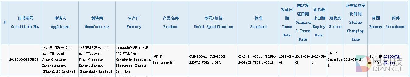 最后一点,也是可能性最小的一种,那就是 PlayStation 中国在为 PS4 Slim 的国行做准备。这么说是因为我们在中国质量认证中心中查询到索尼电脑娱乐(上海)有限公司已经在2016年8月18日将国行 PS4 主机的 3C 认证注销了。