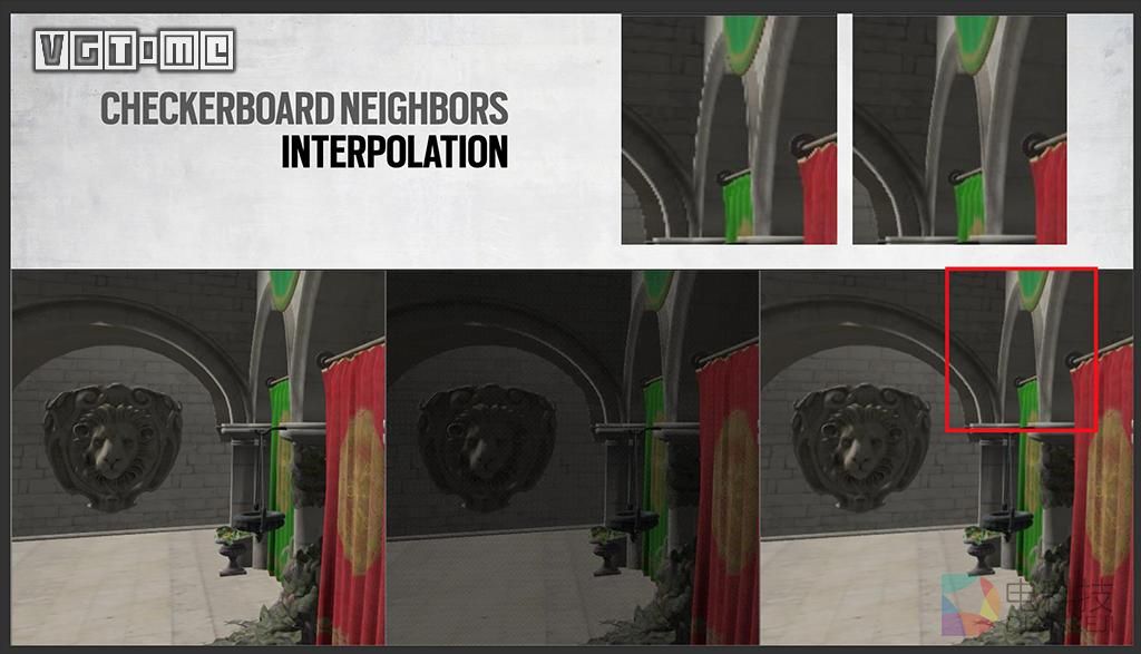 至于棋盘渲染,就像它名字所形容的,是以“格子状”进行的。比如原本 1920 x 2160 的画面,通过识别上下左右的四个像素,插入一个新像素,就可以将画面撑到 3840x2160。育碧《全境封锁》开发团队在今年的 GDC 上就公布了这一成果并获得了关注。同样,配合上述的 ID Buffer,可以做到更好的抗锯齿,获得更好的 4K 效果。