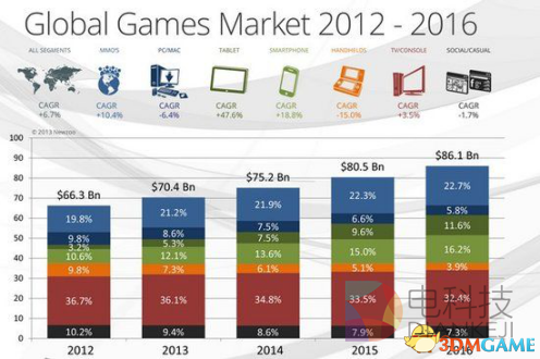 与习惯于用PC玩端游的中国市场不同,全球看来,即使在移动端游戏的疯狂冲击下,主机游戏依然保持着32%左右的最高份额,在2012年之前,这一数字可以达到40%。