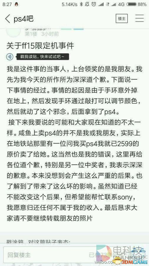 后来还有自称是当事人的回帖,不过他表示闲鱼上挂出来卖的并不是他,因为他在地铁站上就已经卖掉了。本来参加发布会来欣赏FF15活动的玩家按说都应该是真爱粉,这利用主办方失误而进行牟利的行为只能说是令人心寒。