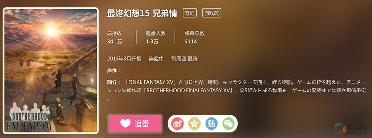东方明珠今年8月在B站上传了《最终幻想15:兄弟情》动画片。这部5集动画片在B站的播放量为34.1万,追番人数1.3万。这两个数据对于FF这个超级IP来说都不算高,不过由官方上传动画片这一行为,在家用主机游戏市场上基本属于首次。