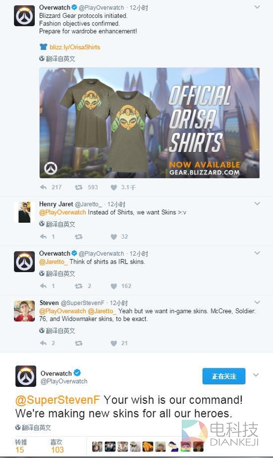 另一位玩家还提出了确切的要求:要麦克雷、士兵76还有黑百合的新皮肤!而官方推特很快回复了该玩家:如你所愿,我们正在为所有的英雄制作新皮肤。