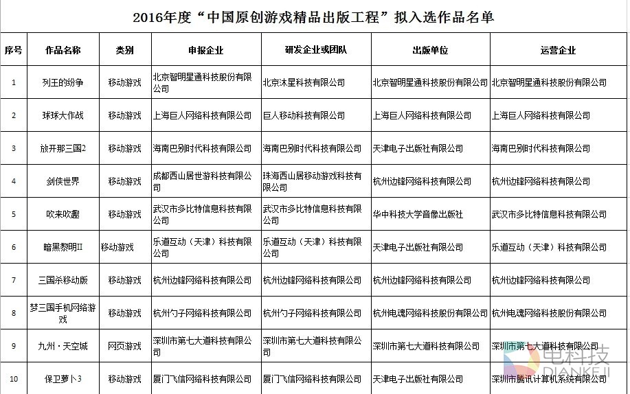 近年来,国家新闻出版广电总 局一直大力扶持国产游戏。去年11月,广电发布《关于实施“中国原创游戏精品出版工程”的通 知》,如今已有阶段性成果出炉,下面是入选作品名单。