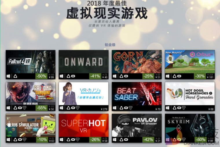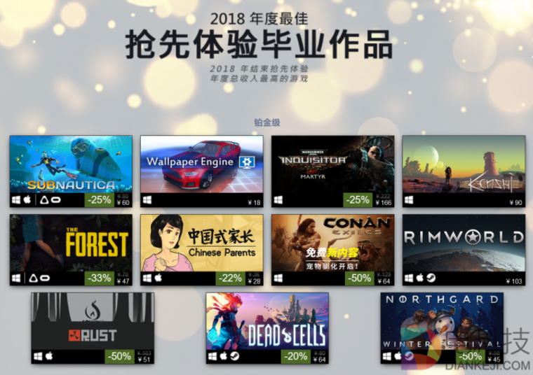 Steam平台公布2018年度最佳排行榜榜单,回顾年度畅销排行榜、人气最高游戏及最热新品等。在最畅销游戏排行榜中,Valve照例为透露具体销售数字,而是将游戏分为4级别:铂金、黄金、