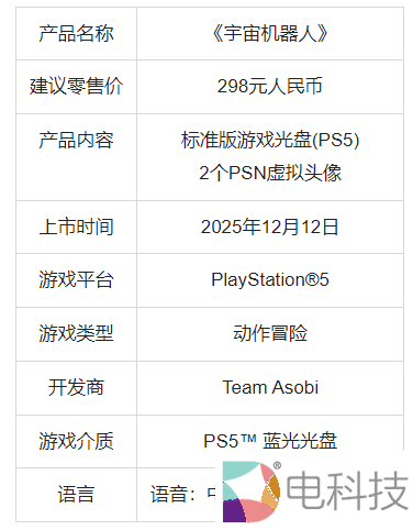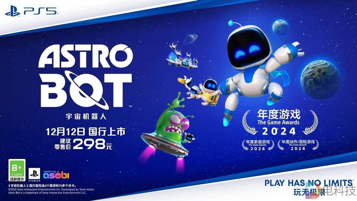 2025年12月12日—索尼互动娱乐(上海)有限公司(以下简称“索尼互动娱乐”)今日公布了《宇宙机器人》国行版游戏于12月12日在中国大陆市场正式发售,上市产品包括PlayStation®5数字版及PlayStation®5实体标准版光盘,建议零售价人民币298元。