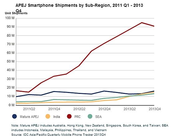 所以说国内智能手机市场已经饱和还为时尚早。其它亚洲国家中,印度超越日、韩,成为全球第三大智能手机市场。另外,由于低端Android 手机的驱动,东南亚国家的智能手机出货量也同样在稳步上升。