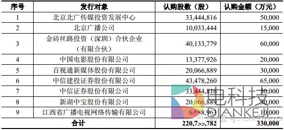 2015年3月7日,本次非公开发行股票数量不超过 220,735,782 股,发行对象为北京北广传媒投资发展中心、北京广播公司、金砖丝路投资(深圳)合伙企业(有限合伙)、中国电影股份有限公司、百视通新媒体股份有限公司、中信建投证券股份有限公司、中信证券股份有限公司、新湖中宝股份有限公司、江西省广播电视网络传输有限公司共九名特定对象,其各自认购数量和金额如下: