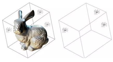 假设我们去掉了玻璃盒子中的兔子,但是这个玻璃盒子是一个魔盒,光场信息被完美保留。当我们观察这一魔盒的时候,所有经过一只眼睛的射线合成了视网膜上的一幅图像。我们可以自由地改变距离和视角,兔子在视网膜上的图像相应地自然变化,根本觉察不到兔子的消失。因此,有了魔盒,我们不再需要真正的兔子。这个魔盒就是兔子的光场。