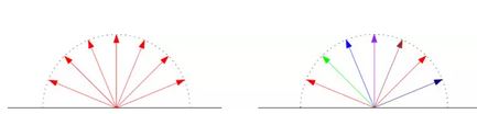 图18. 显示模式对比:左图是传统屏幕,过一点的所有射线同样颜色;右图是光场显示,过一点的不同射线不同颜色。