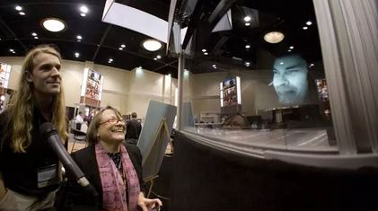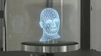 USC的光场显示 南加州大学提出并制作了一种光场显示装置,如图19、20所示,有一个四面透光的玻璃柜子,柜子中间是一面和水平面夹角为45度的镜子,柜子顶部安装了一台高速投影仪,投影仪垂直向下投影,光线经过镜子反射后水平射出。同时,镜子高速旋转。一颗幽灵般的透明人头悬浮在空气之中,当我们绕着柜子走的时候,我们可以看到人头的各个侧面,并且这颗人头对你挤眉弄眼。