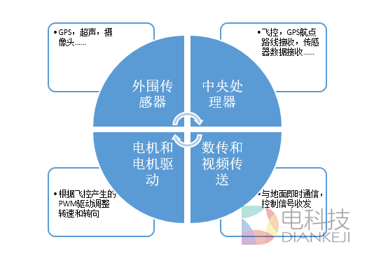 目前看来,市场上较为流行的消费级多旋翼无人机中,无论是在飞控算法和云台控制上有优势的大疆,还是在自动控制和传感器应用上具有技术领先的3D Robotics和Parrot,其操作系统架构基本由中央处理器(MCU、ARM早期型号、ARM Cortex系列)、外围传感器(GPS、超声、摄像头等)、电机和电机驱动芯片、数传模块和图像传输模块组成。总结如下