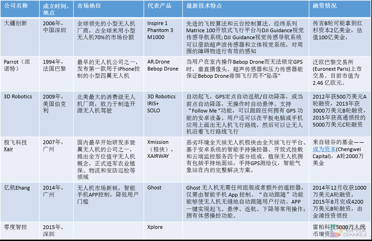 下表是对市场上几家著名的无人机厂商的融资情况和技术特点做一个简单的总结。