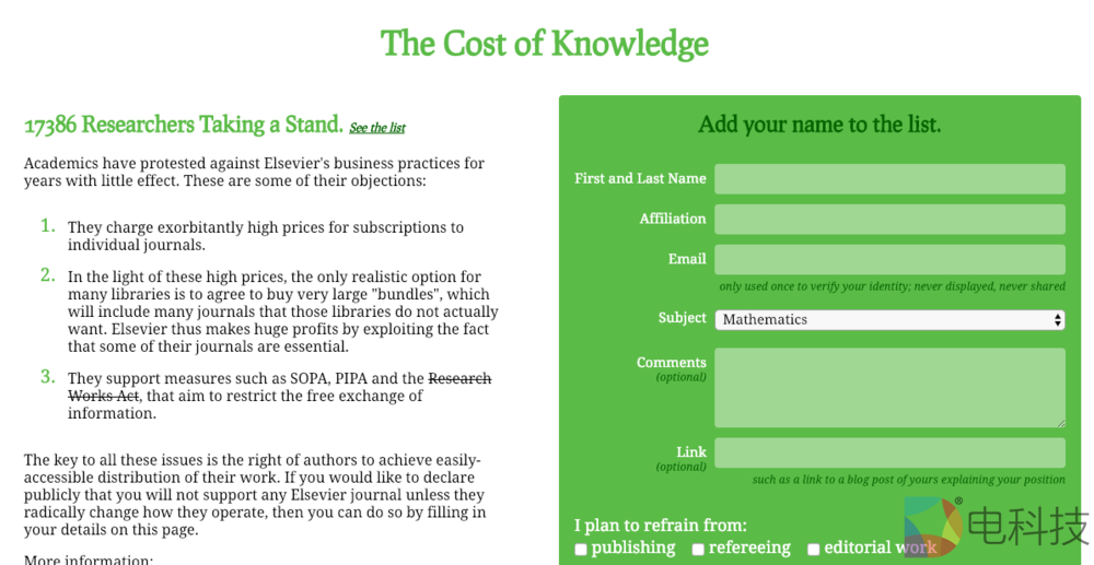 随后,便有学者建立起名为“知识的代价”(Cost of Knowledge)的网站,开启抵制爱思唯尔旗下学术期刊“盘剥科学”的签名活动。除了收费高昂以外,亦有学者表示,爱思唯尔还会采用捆绑销售的方式“强迫图书馆订阅许多他们不需要的刊物”。据光明日报报道,这项活动半年间就已获得全球超过1.2万名科学界知名人士签名声援,签名支持的包括来自牛津大学、哈佛大学、剑桥大学、伦敦大学学院等学校的学者。