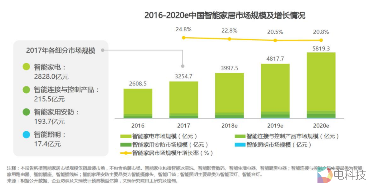 与功能丰富的物联网平台相对应的是国内智能家居市场日益增长的需求与产品缺口,根据艾瑞咨询《中国智能家居行业研究报告2018年》数据,“2017年国内智能家居市场规模达到3342.3亿元,同比增长24.8%”,其中智能家电占比为86.9%。艾瑞咨询预测“三年内,智能家居市场将保持21.4%的年复合增长率,到2020年市场规模将达到5819.3亿元”。