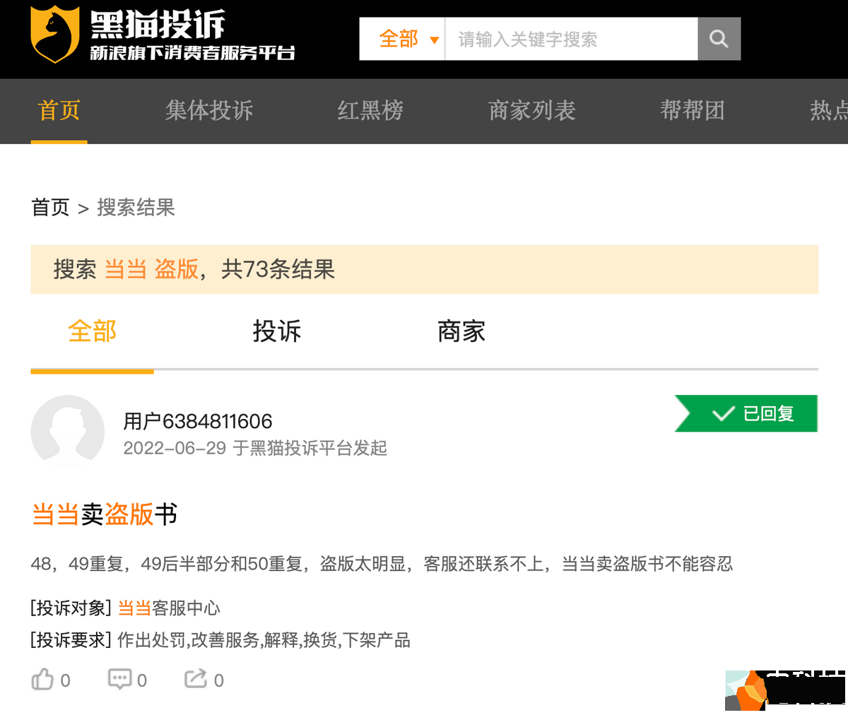 这样的案例在当当不是个例,在黑猫投诉平台搜索“当当 盗版”可以看到73条类似投诉。