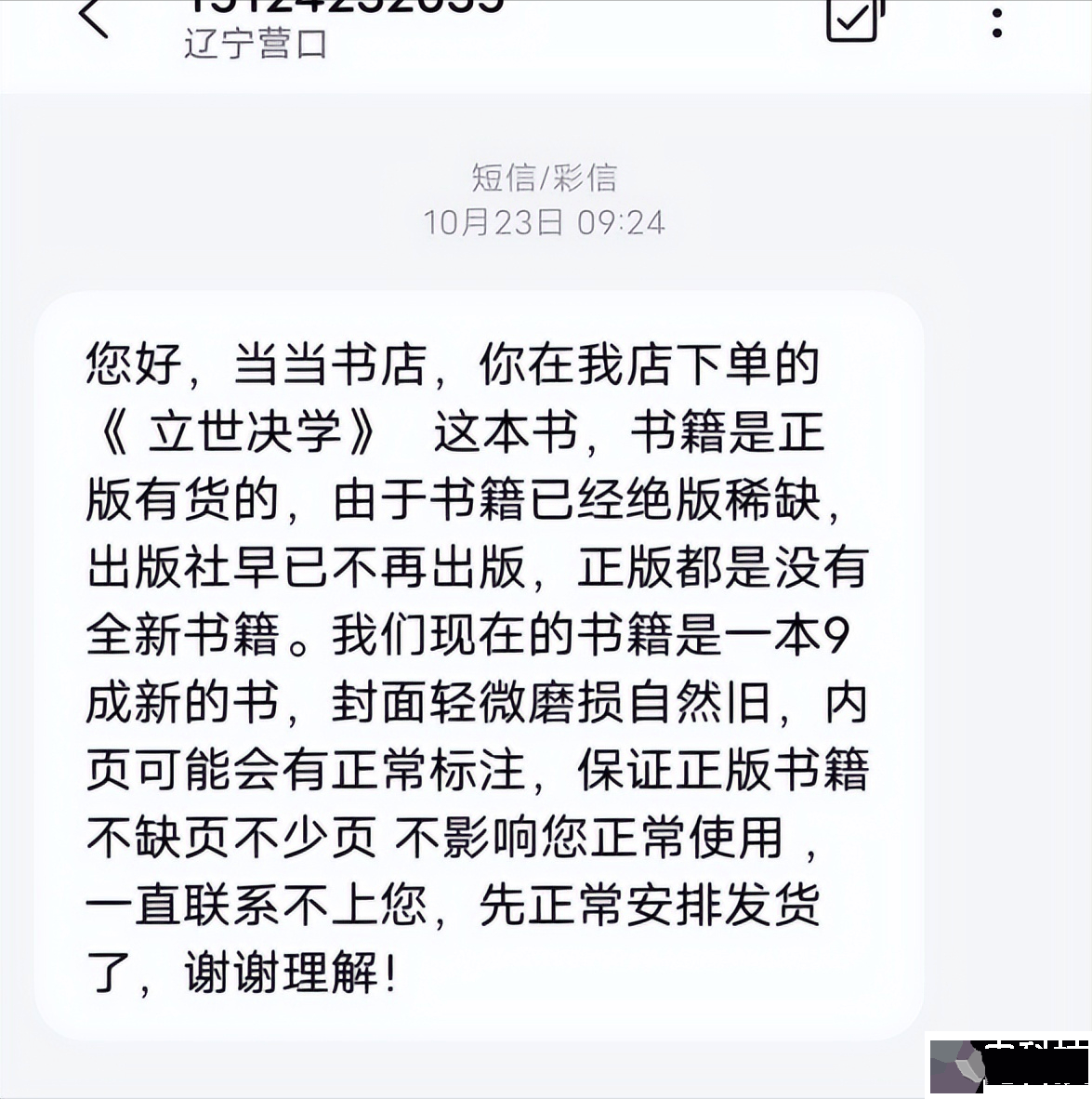 比如有的用户收到的确实是正版书,但却是二手的。某位用户在当当网下单了一本《立世绝学》,隔天收到一个手机号发来的信息,表示“书籍绝版稀缺”…“我们现在的书籍是一本9成新的书”…“正常安排发货了”。