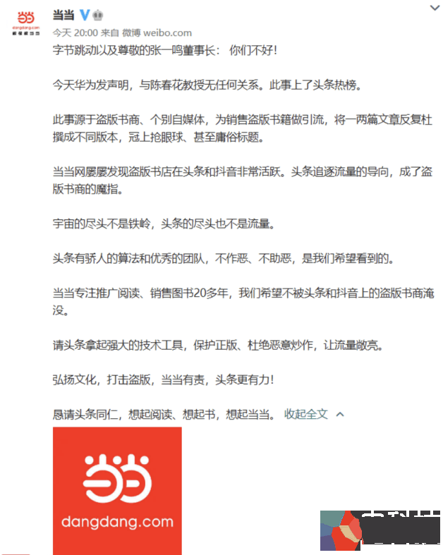 而当当网的公开信从华为-陈春花教授事件绕到头条、抖音助纣为虐销售盗版书,未免无厘头了,这流量“蹭”得不太高明。因为陈春花教授团队任由网络上充斥上万条谣言营销号文章,显然不是为了让盗版商借此引流侵犯自己的版权。所以当当网公开信的底层逻辑其实是有些站不住脚的。