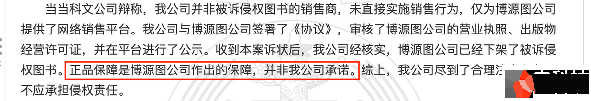 但当当网却表示,“正品保障是博源图公司作出的保障,并非我公司承诺”。