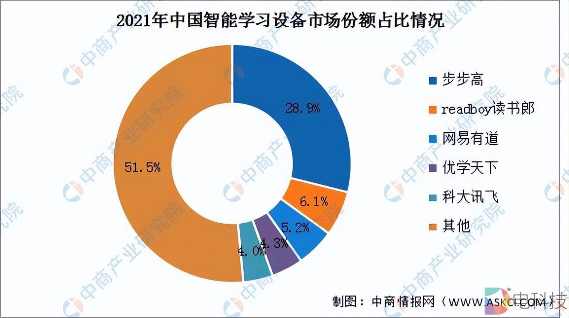 中商情报网的数据显示,2021年中国智能学习设备市场,排名前三的品牌分别为步步高、读书郎以及网易有道,市场份额分别为28.9%、6.1%以及5.2%,反观科大讯飞的市场份额仅为4%。