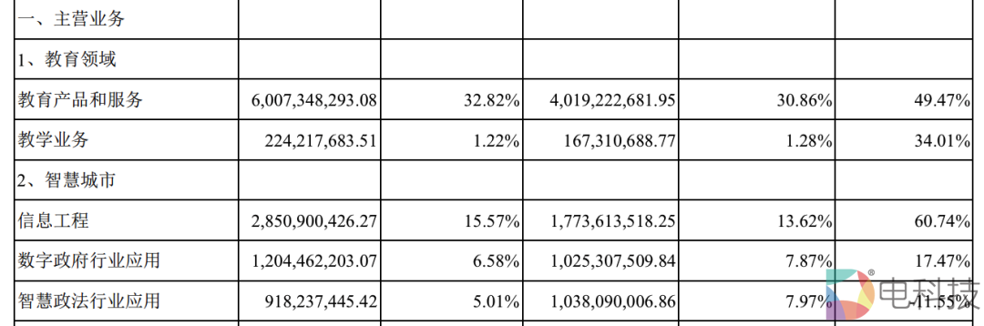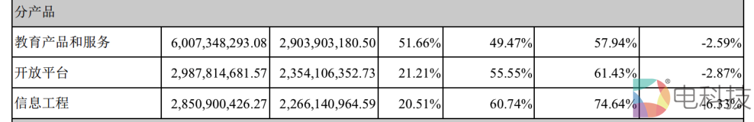 财报显示,2021年,科大讯飞三大主营业务分别为教育产品与服务、信息工程以及开放平台,营收占比分别为32.82%、15.57%以及16.31%,合计64.7%。