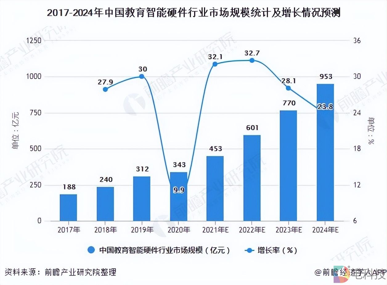 作为对比,前瞻产业研究院数据显示,2020年,中国教育智能硬件市场规模为343亿元,预计2024年,这一数字将达953亿元。