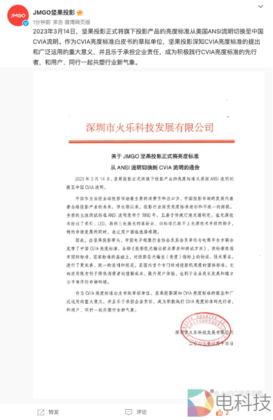 亮度,指的是光线的强度,单位是流明(lm),亮度越高,看到的图像越清晰,越不受环境光线限制。需要注意的是,不同的品牌在投影仪亮度的标注上采取标准不一,如ANSI亮度、ISO流明、ANSI流明等,亮度“虚标”之风盛行。但在今年2月,坚果投影牵头、十多家企业确定了行业新标准——CVIA,相当于投影有了自己的国标。
