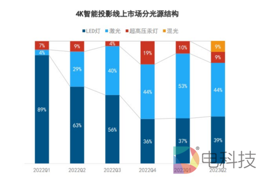 市场也给出极大反响,自从三色激光投影仪上市后,激光光源(含单色激光)市场份额迅速上涨,截止目前激光已超越LED成为最主流光源技术。