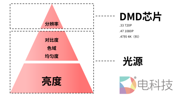 因此,投影画质实际上是一场综合素质比拼,事关硬件,而以上5个核心画质参数由“光源”和“DMD”芯片决定。不过,与手机不同的是,芯片对投影仪的重要性并非那么关键,仅影响分辨率这一项参数。此外,目前市面上仅有德州仪器一家掌控着DMD芯片的生产和销售,换言之,市面上投影仪用的芯片差别不会太大。