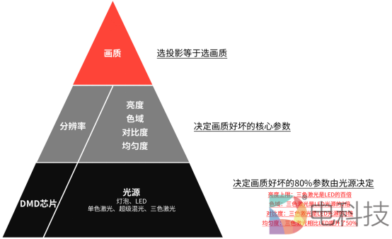 而剩下80%跟画质相关的亮度、色域、对比度、均匀度全部由光源决定,因此,选投影其实是选画质,而量化投影画质的好坏,关键看光源!