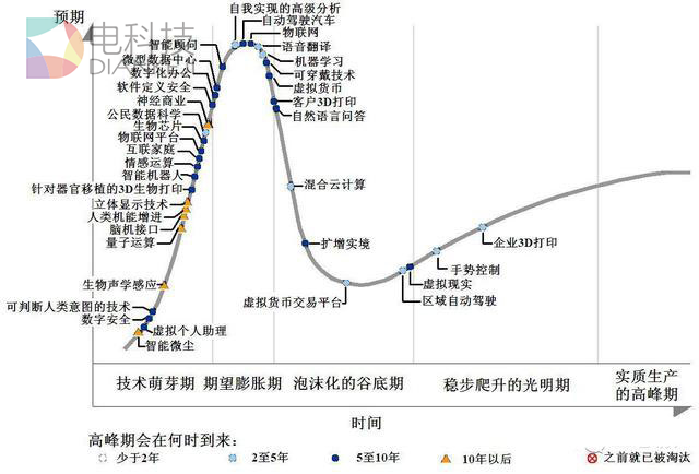 图为Gartner发布的2015年度新兴技术成熟度曲线图,混合云计算上榜