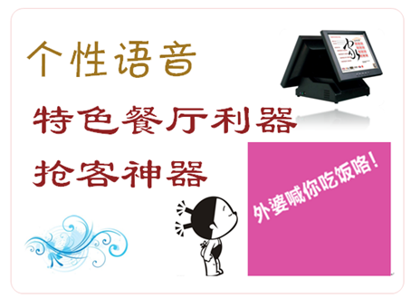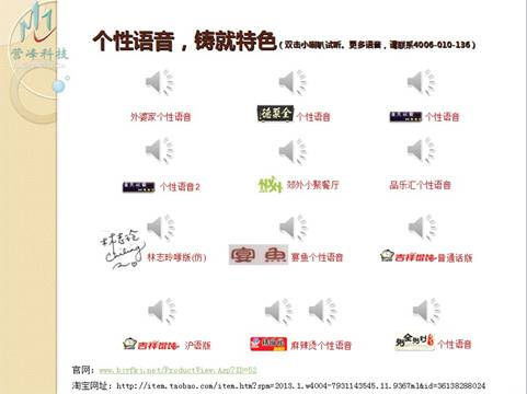 该公司网站支持在线试听个性化语音:http://www.bjyfkj.net/ProductView.Asp?ID=52,大家可以进网站选选适合自己餐厅的个性化语音,进一步强化自己餐厅的特色,让生意越来越火!