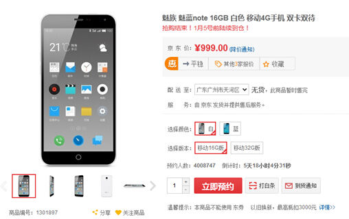 魅族新机魅蓝note昨日同时在魅族官方商城、京东商城、拍拍网三大平台开卖,成功订购的用户预计在10天之内完成发货。以京东商城为例,开卖前夕高达400万台的预约量,导致魅蓝note一经上架便被秒光。