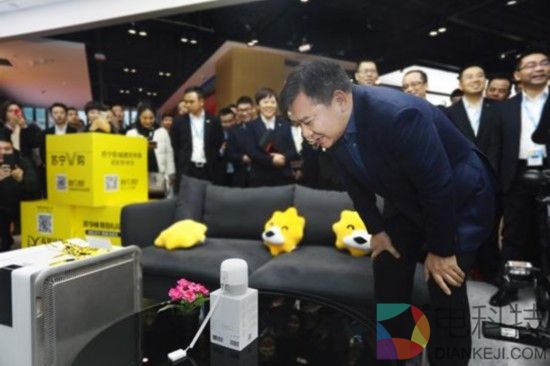 (图:张近东在南京新街口苏宁易购云店与苏宁小Biu智能音箱对话)