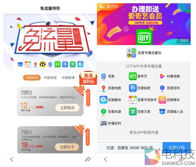 同时可享受包括百度APP、爱奇艺、百度地图、百度贴吧、好看视频、手机助手、百度糯米、百度输入法、百度翻译、百度文库、百度知道、百度百科、秒懂百科等等13个百度系平台的免流特权!