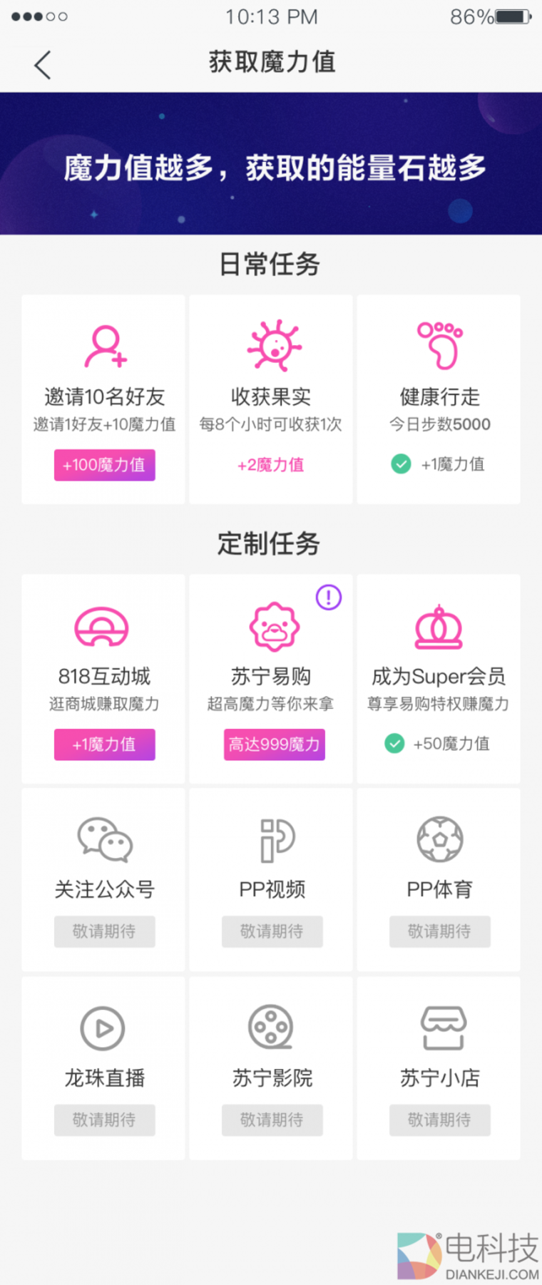 目前“星际家园”处于内测阶段。星际家园是一款搭载在区块链技术上的生态产品,通过全新场景整合方式,搭建家园商业模式,实现数据、流量变现。居民注册登录后通过完成任务获取魔力值,魔力值的获取主要通过完成家园建设、邀请好友、健康行走等日常基础任务,以及完成平台上不定期上线的苏宁全产业定制任务比如818互动城、苏宁易购、PP体育、PP视频、苏宁小店等任务。用户获取的魔力值将直接影响能量石的分配,魔力值越高,同时段获取的能量石越多,能量石是居民在星际家园活动中获得的奖励,用于星际家园的消费与兑换,能量石总数有限,越早加入越活跃的居民奖励越多。