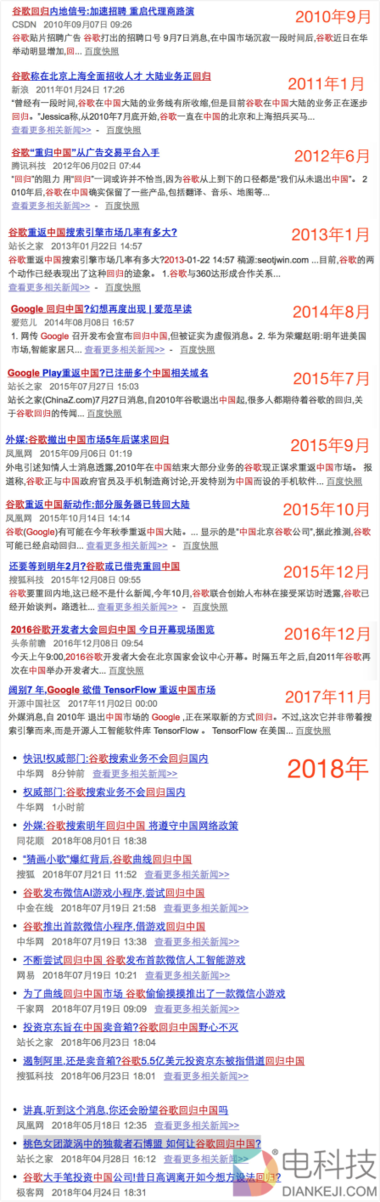 2010年1月,Google表示不再为谷歌中国搜索结果提供过滤服务,同年3月份,Google中国以“遭到黑客攻击的理由”指责中国再次宣布停止对谷歌中国搜索结果进行过滤的服务。2012年12月朋友圈传出的谷歌回归中国的消息遭到谷歌中国区公关负责人辟谣。即便去年有消息称谷歌在北京组建人工智能团队,但其人工智能开发工具TensorFlow被爆出安全漏洞,一旦有人存心攻击此漏洞,其背后隐藏的国家安全问题并非杞人忧天。于是谷歌以人工智能入华的计划没有任何进展。另外,目前谷歌虽已开放谷歌地图、翻译等业务面向中国大陆,但谷歌目前并没有明确回应回归中国大陆地区的事宜,商业化落地也没有任何进展。